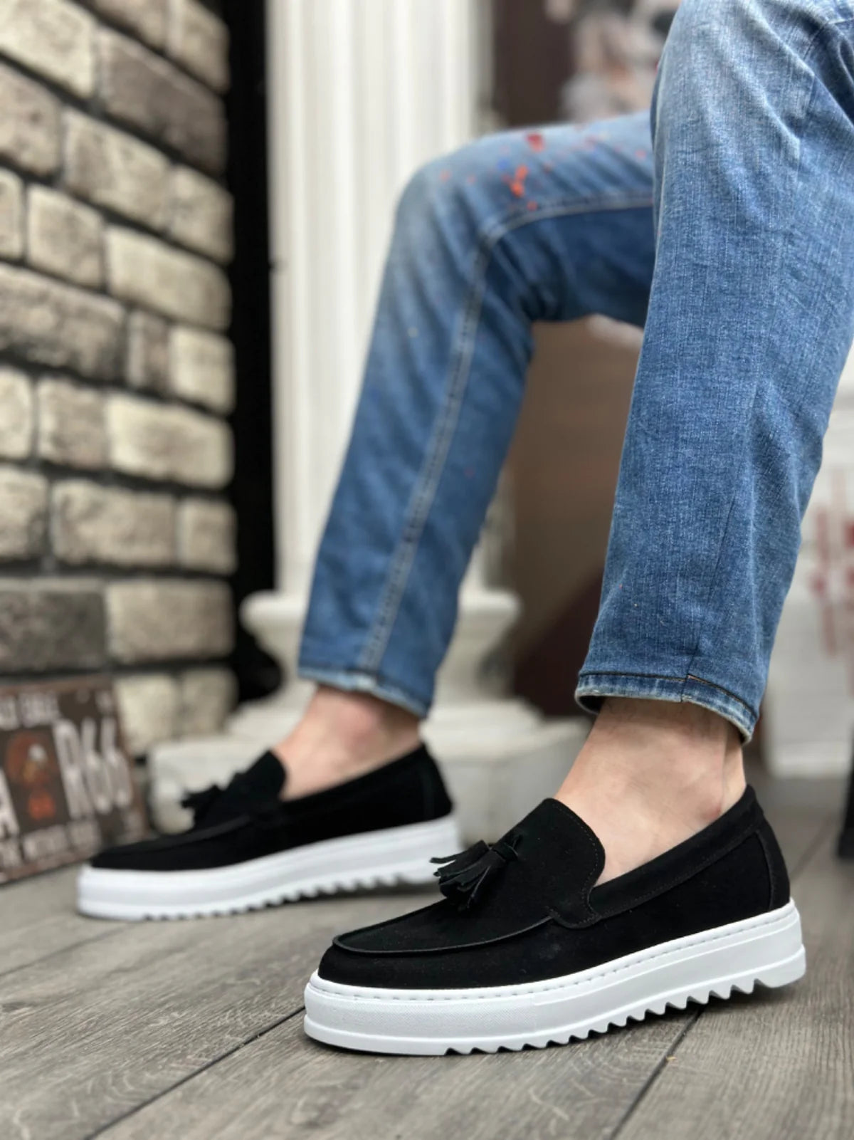 haussures homme sans lacets en daim noir, à semelle haute blanche, avec pampilles